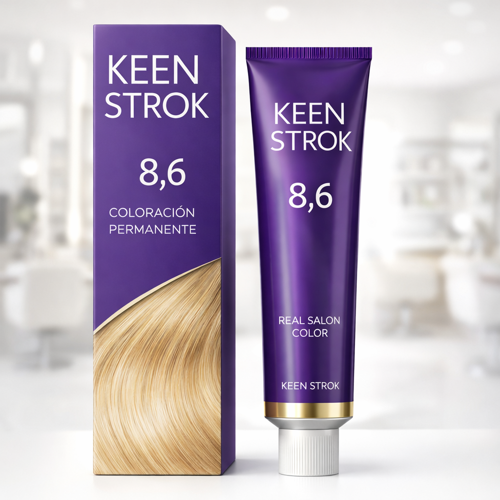 Tinte de coloración 8,6 KEEN STROK para un acabado profesional: color uniforme, brillo y cobertura fiable.